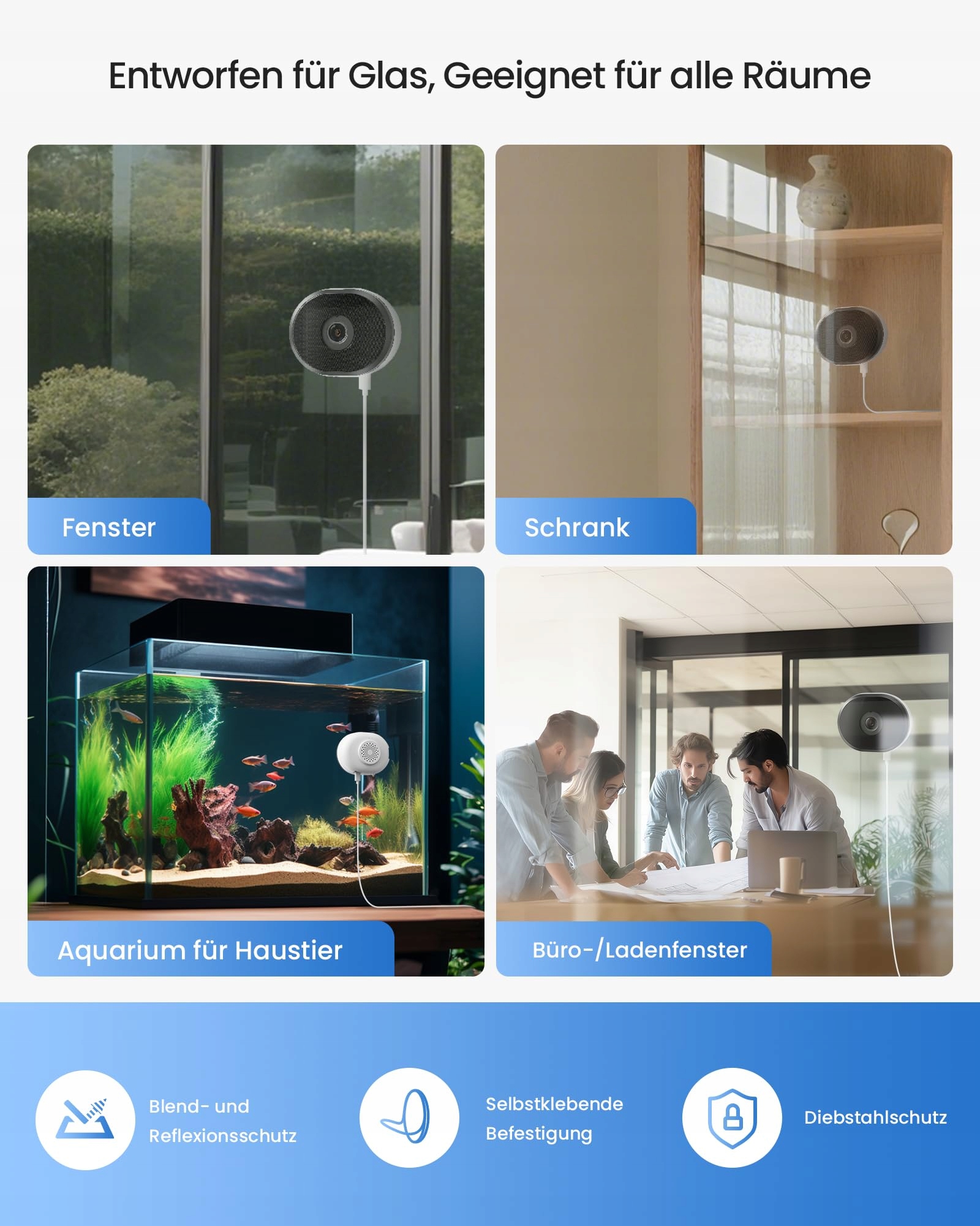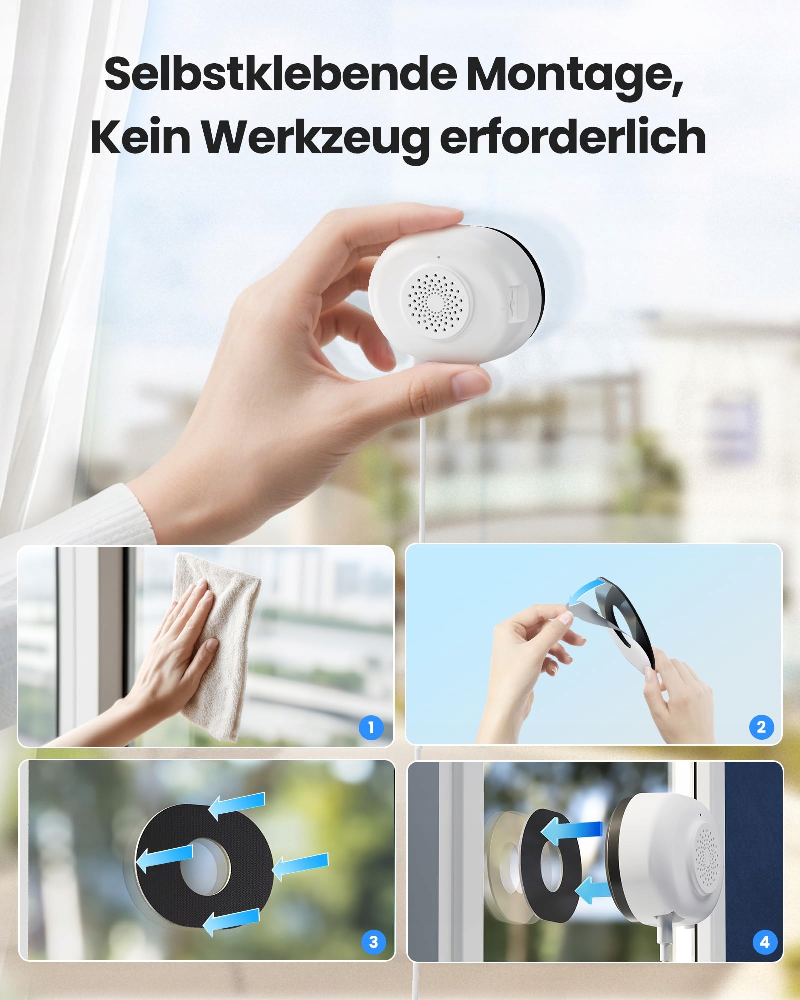 (3) [Szybki montaż na rzepy i plug-and-play] Bez wiercenia, bez plątaniny kabli. Ramka montażowa z klejem mocuje kamerę w kilka sekund na powierzchniach szklanych. Po prostu podłącz, ustaw – i gotowe do użycia. Skuteczna ochrona przed kradzieżą.
