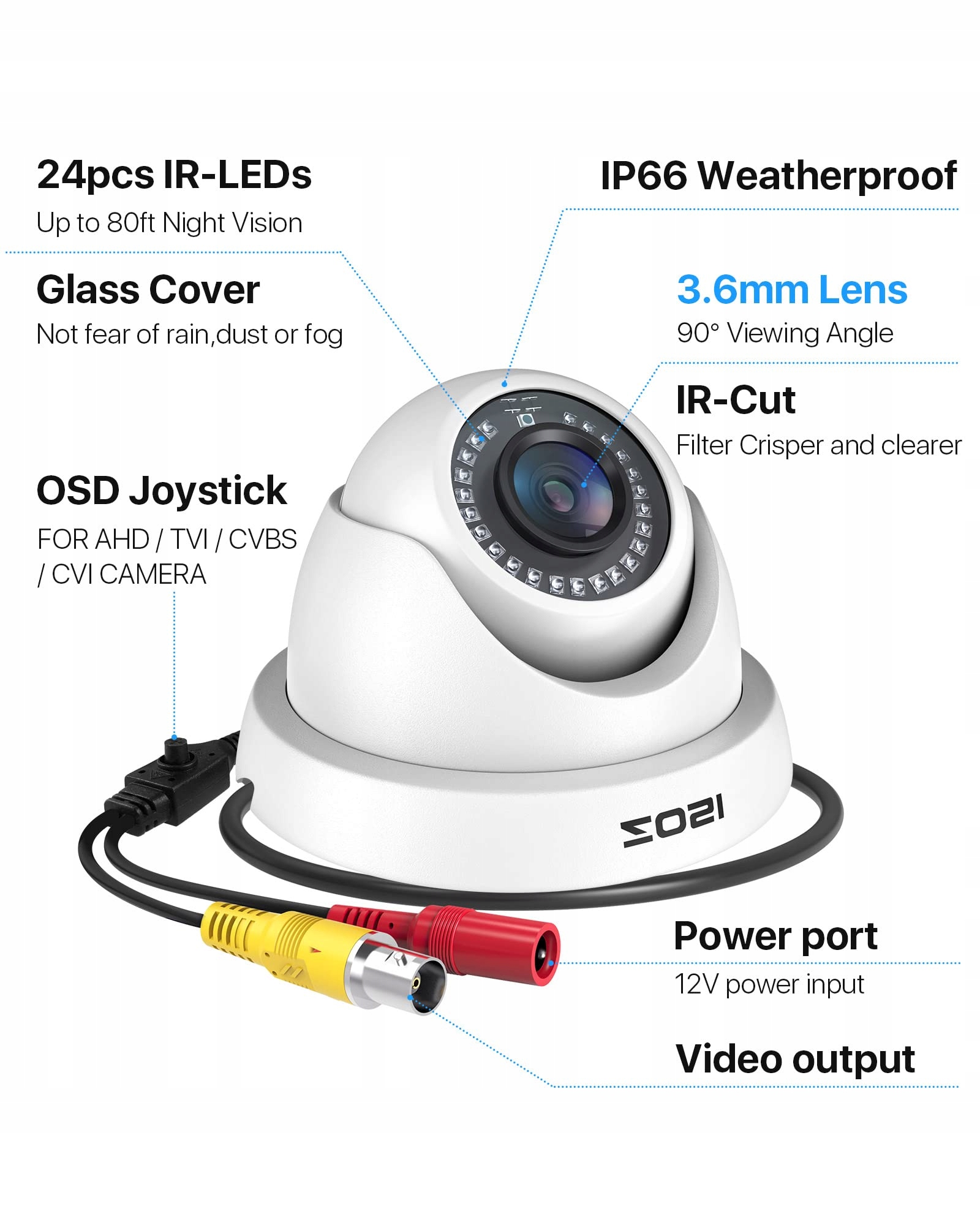 [Kabel CCTV i zasilacz nie w zestawie] 1. To jest kamera z przewodem stałym, która musi być podłączona do kabla CCTV i zasilania (nie w zestawie). 2. Ta kamera nie może działać samodzielnie, musi być podłączona do DVR, aby działać.