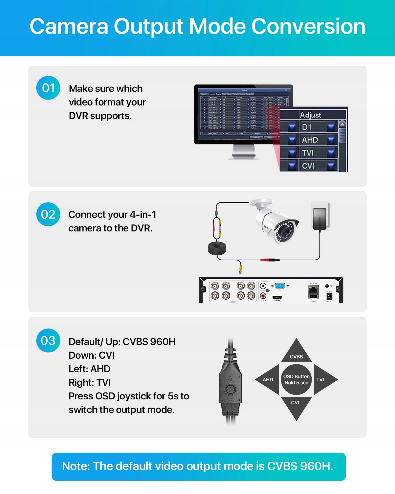 4 rodzaje wyjść wideo - AHD, CVI, TVI i CVBS/960H. Standardowy tryb wideo to TVI 1080P, kompatybilny z prawie wszystkimi analogowymi rejestratorami DVR. Za pomocą przycisku OSD można szybko zmienić tryb sygnału w ciągu 5 sekund.