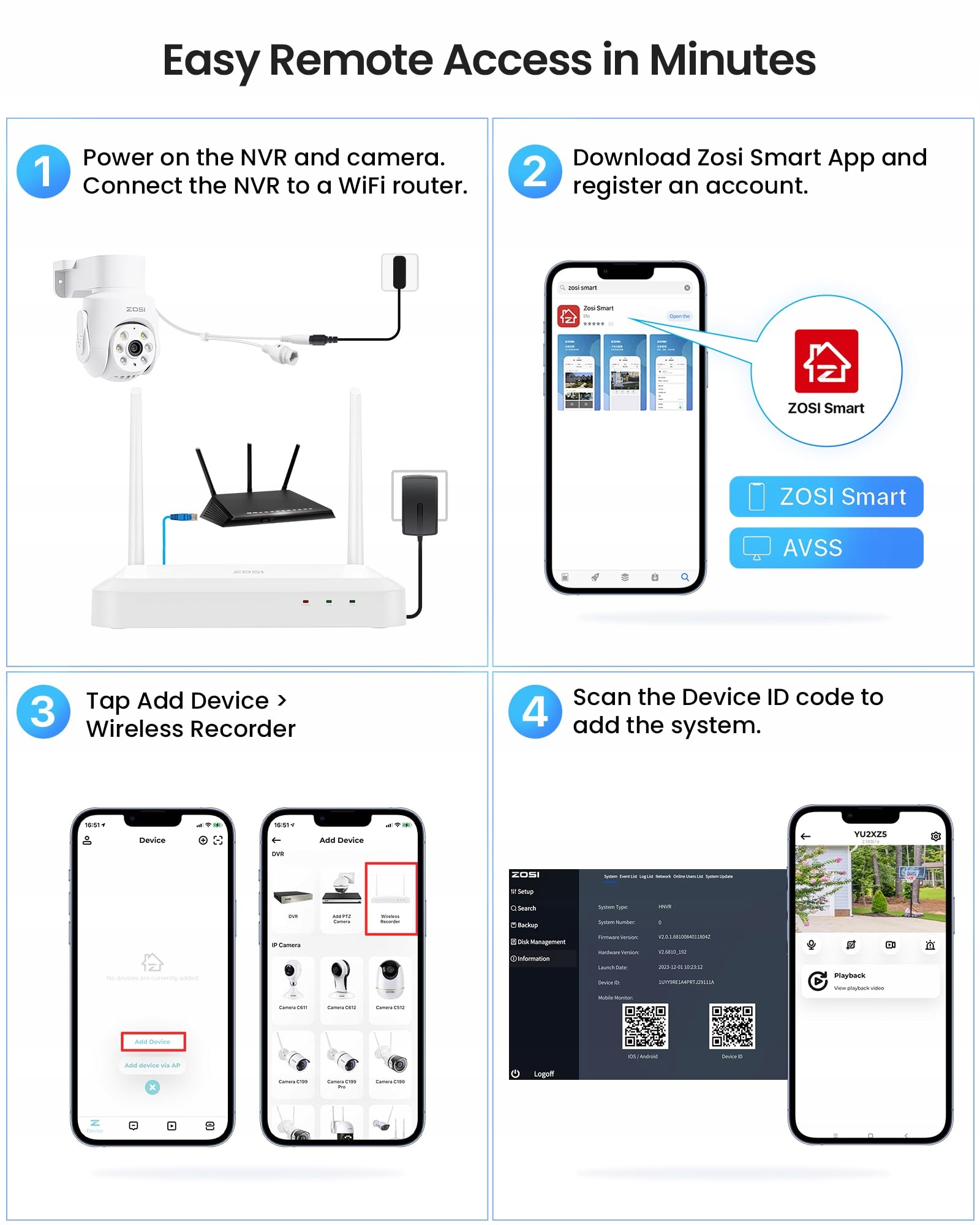 Kompatybilna z systemem ZOSI: Proszę pamiętać, że ta kamera WLAN jest kompatybilna tylko z systemem ZOSI i nie może być używana samodzielnie. Działa jako kamera zamienna/dodatkowa do systemu ZOSI NVR. Aby zapewnić pełną funkcjonalność, wymaga połączenia z ZOSI NVR (model nr ZR08WS/08WU).