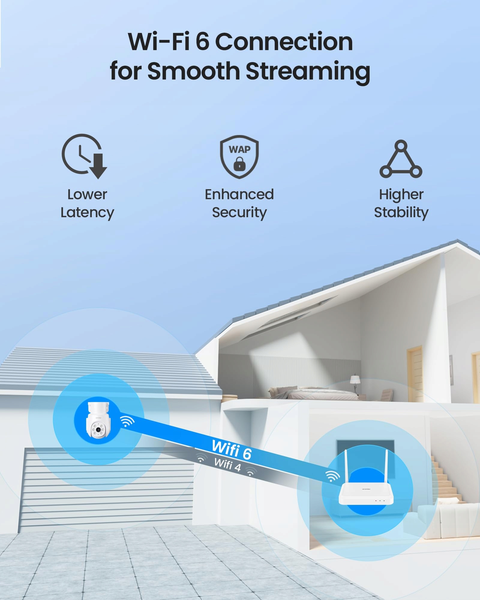 Technologia WiFi 6: Dzięki naszej kamerze do monitoringu C280 WiFi 6 zyskujesz stabilniejsze połączenia, szybszą transmisję wideo i znacznie zredukowane opóźnienia. Dla najlepszego doświadczenia zalecamy użycie routera obsługującego WiFi 6. Zapewnia to niezrównaną jakość monitoringu i płynną pracę Twoich rozwiązań bezpieczeństwa.
