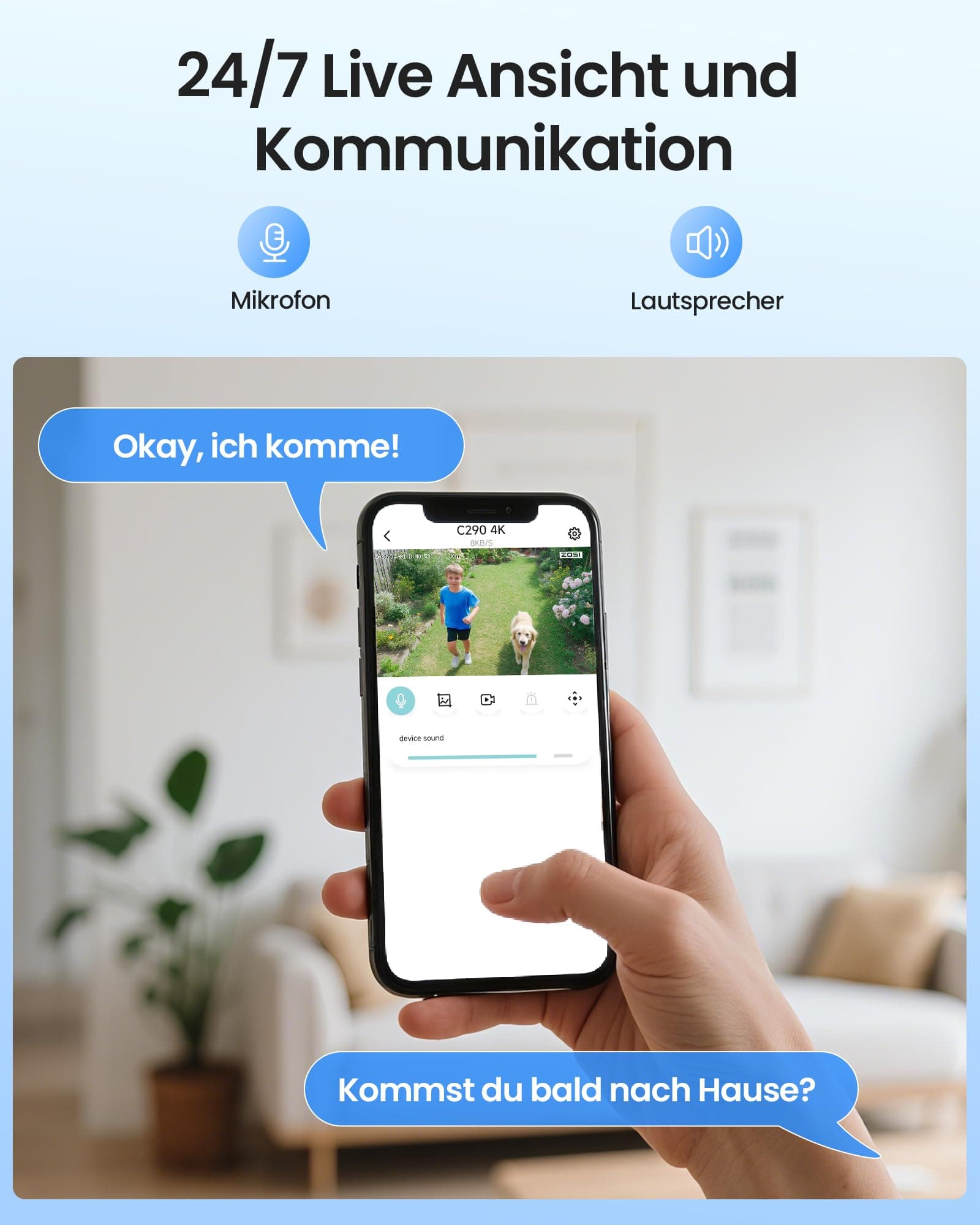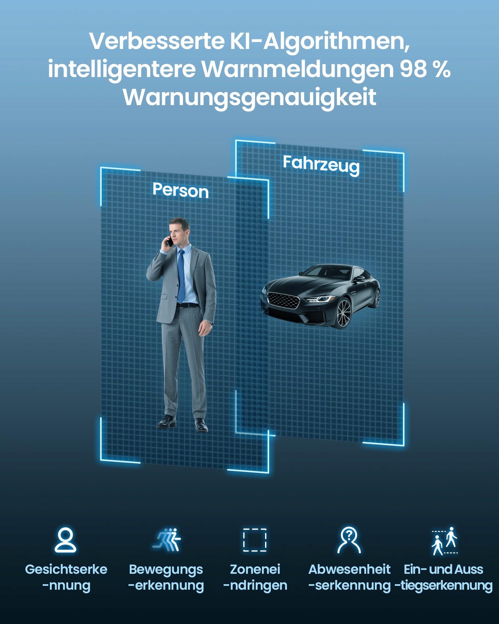3. Inteligentna kamera WLAN do domu z rozpoznawaniem osób i pojazdów opartym na AI: Kamera bezpieczeństwa 4K z AI precyzyjnie rozpoznaje osoby i pojazdy oraz redukuje fałszywe alarmy, aby otrzymywać tylko istotne powiadomienia push o zdarzeniach. Dzięki temu zawsze jesteś na bieżąco i możesz natychmiast reagować na podejrzane ruchy. Skuteczna kontrola dostępu do podjazdów, wejść lub sklepów.