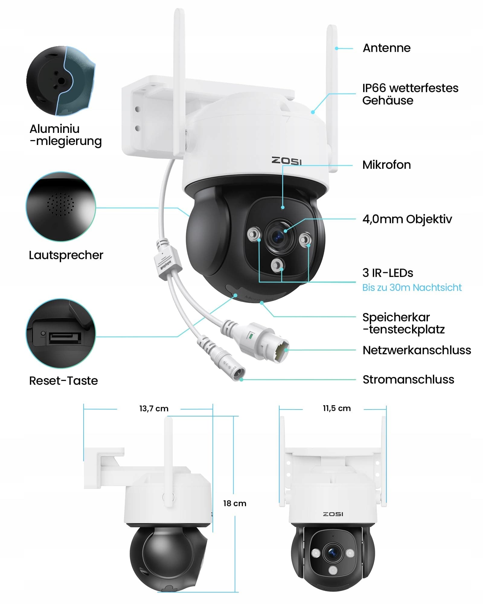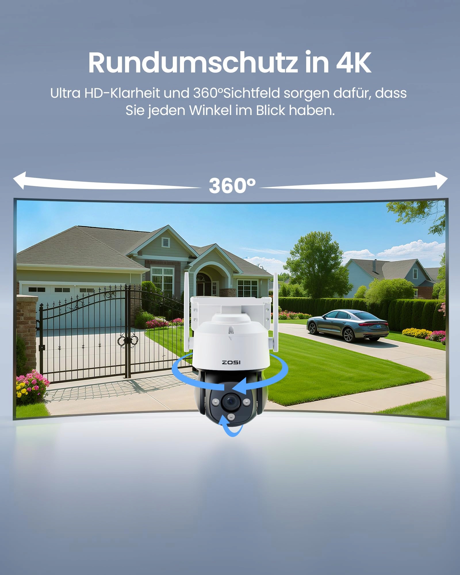ZOSI 4K 8MP Kamera do monitoringu WLAN na zewnątrz z kartą 64GB, kamera PTZ 360°, rozpoznawanie osób i pojazdów, automatyczne śledzenie, dwukierunkowe audio, podczerwień do nocnego widzenia