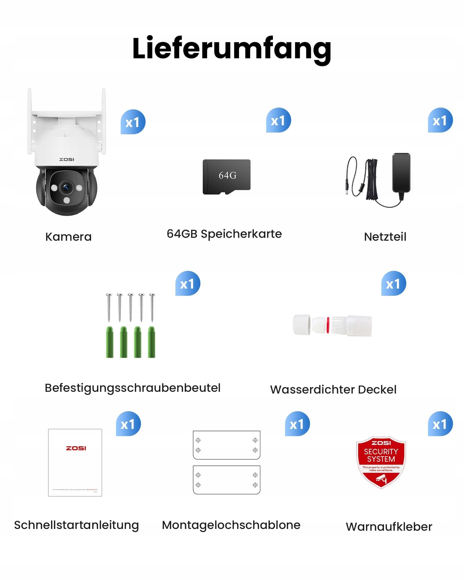 2. Karta pamięci 64GB i zasilanie sieciowe: Ta kamera zewnętrzna jest dostarczana z wstępnie zainstalowaną kartą pamięci 64GB i jest gotowa do użycia od razu. Nagrywanie wideo odbywa się bezpośrednio na karcie pamięci lub opcjonalnie w chmurze. Dzięki technologii Wi-Fi 6 i zasilaczowi typu plug-in kamera 2,4G oferuje stabilne połączenie WLAN (bez 5G). Idealne rozwiązanie zabezpieczające dla domu i firmy.