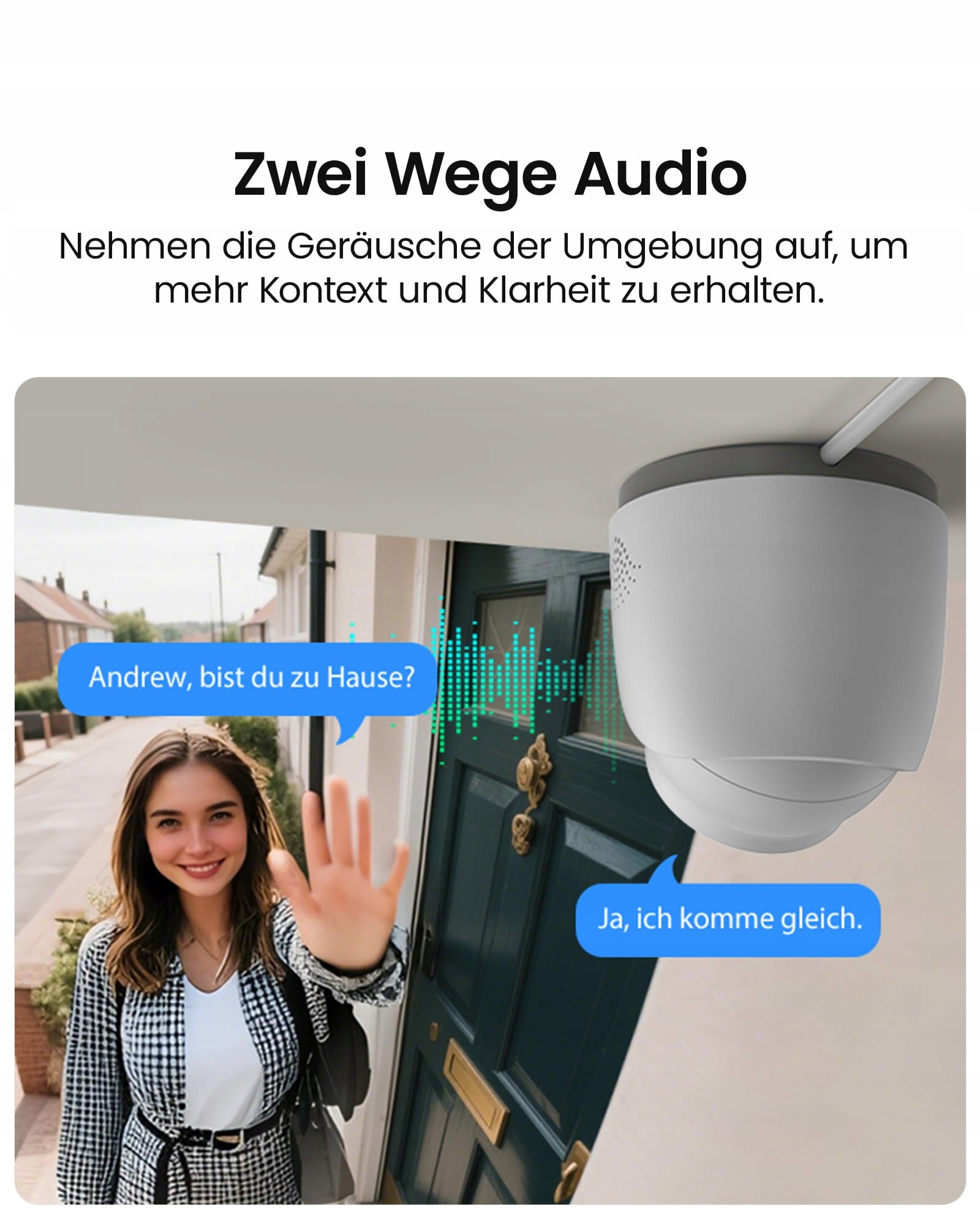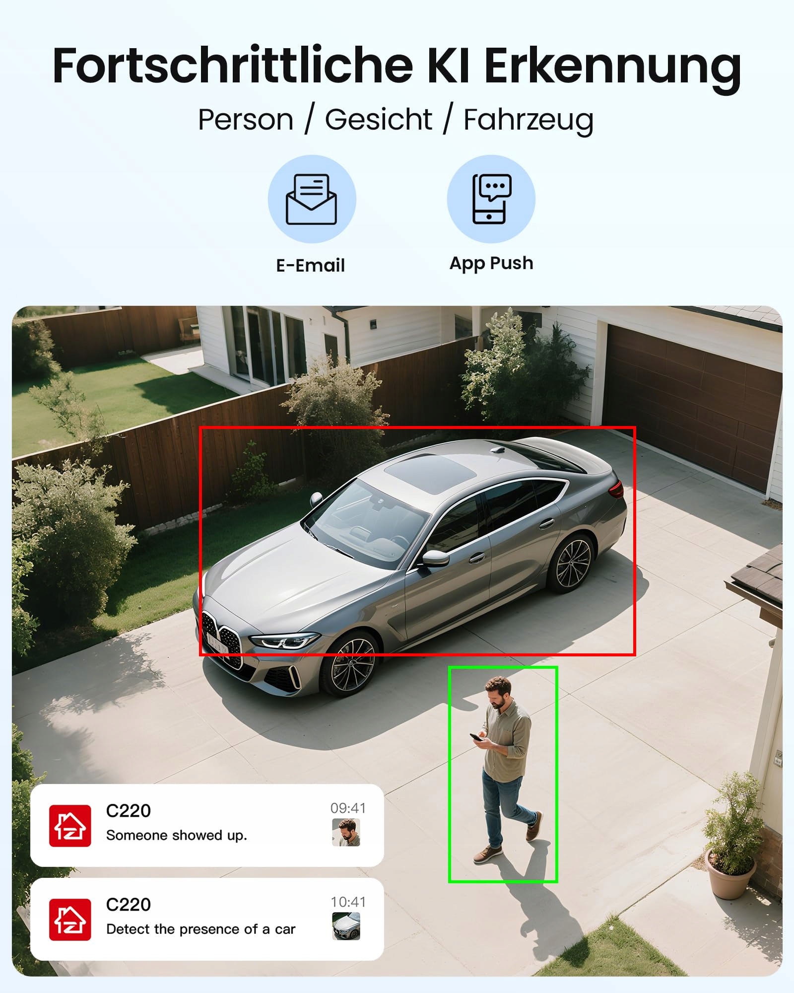 𝗜𝗻𝘁𝗲𝗹𝗶𝗴𝗲𝗻𝘁𝗻𝗲 𝗿𝗼𝘇𝗽𝗼𝘇𝗻𝗮𝘄𝗮𝗻𝗶𝗲 𝗼𝘀𝗼́𝗯 𝗶 𝗽𝗼𝗷𝗮𝘇𝗱𝗼́𝘄: Sterowane sztuczną inteligencją wykrywanie precyzyjnie identyfikuje osoby i pojazdy. Możesz indywidualnie dostosować strefę wykrywania. Gdy zostanie wykryty ruch, otrzymujesz natychmiastowe powiadomienie na smartfon. Dzięki temu szybko reagujesz na podejrzane zdarzenia i zwiększasz swoje bezpieczeństwo.