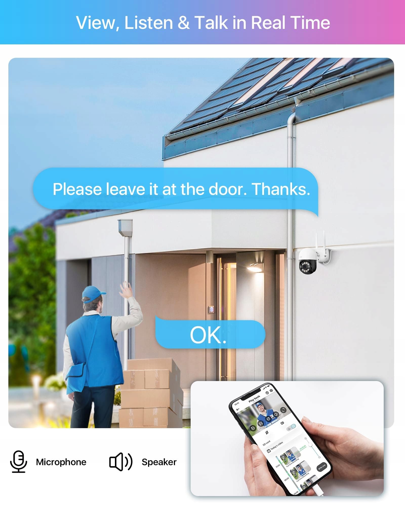 𝗗𝘄𝘂𝗴𝗼𝗿𝘇𝗲𝗻𝗻𝗮 𝗰𝘇𝘆 𝗗𝗜𝗬 𝗰𝘇𝘆𝗻𝗻𝗼𝘀́𝗰́ 𝗺𝗼𝘄𝘆: Wbudowany mikrofon i głośnik umożliwiają nagrywanie dźwięku i rozmowę z osobą przed kamerą zewnętrzną. Możesz także nagrać własne, indywidualne powitanie lub odstraszacz, aby uczynić ochronę jeszcze bardziej osobistą.