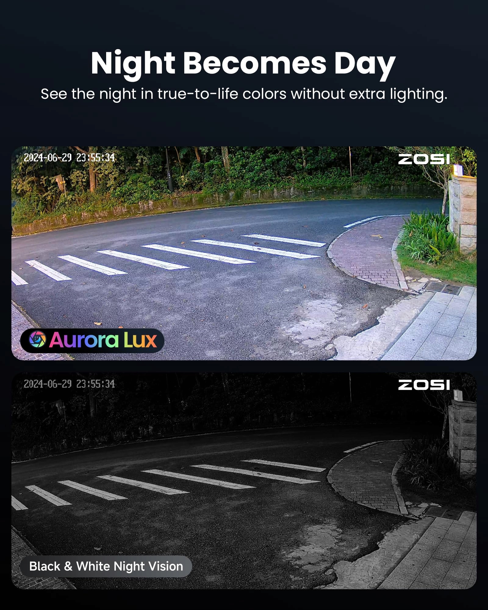 ZOSI 5MP WLAN Kamera do monitoringu zewnętrznego, 2,4GHz/5GHz IP WLAN Kamera Outdoor z nocnym widzeniem w rzeczywistych kolorach, przysłona F1,0, AI wykrywanie osób/pojazdów, C186A AuroraLux