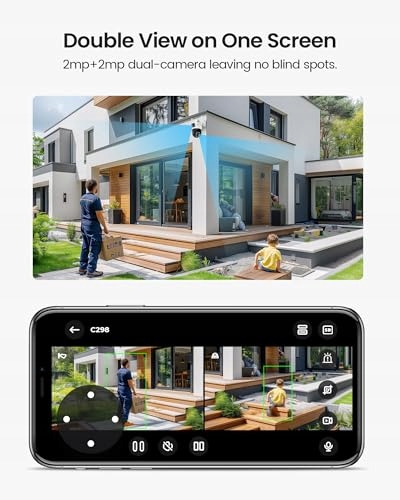 ZOSI Kamera PTZ z podwójnym obiektywem do monitoringu zewnętrznego WLAN, 2MP+2MP, kamera WiFi 2,4 GHz z wykrywaniem osób/pojazdów, automatycznym śledzeniem, kolorowym widzeniem nocnym, dwukierunkowym audio, reflektorem i syreną ostrzegawczą, C298