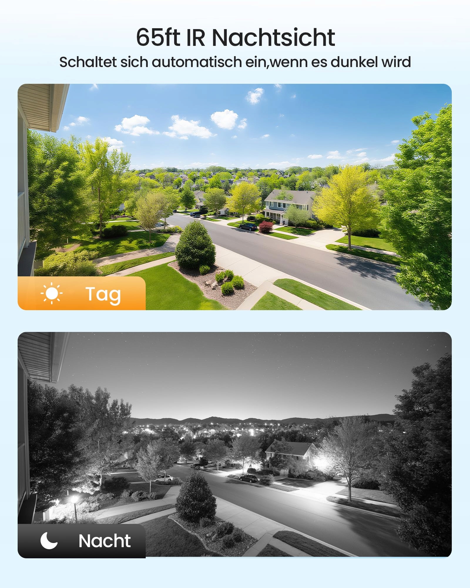 Wykrywanie i powiadomienia wspierane przez AI: Dzięki precyzyjnemu algorytmowi AI kamera bezpieczeństwa niezawodnie rozróżnia osoby i pojazdy, co znacznie redukuje fałszywe alarmy. W przypadku zagrożenia otrzymasz powiadomienia push w aplikacji i e-mailem, dzięki czemu zawsze masz kontrolę.