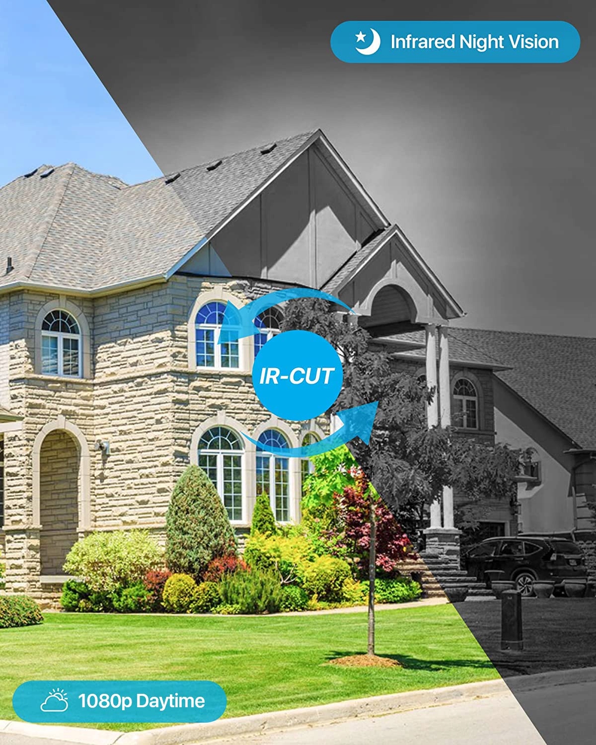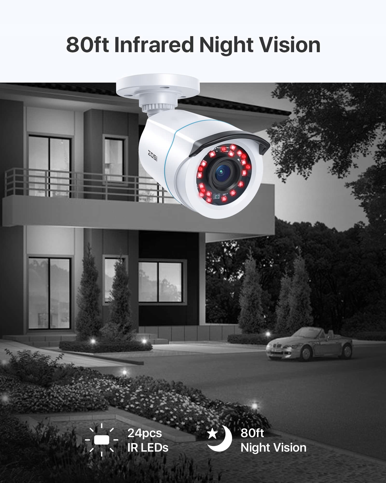 【Ochrona bezpieczeństwa 24/7 przez całą dobę】Kamery z funkcją noktowizji wyposażone są w 24 diody IR-LED, które włączają się automatycznie po zmroku, zapewniając zasięg do 20 m.