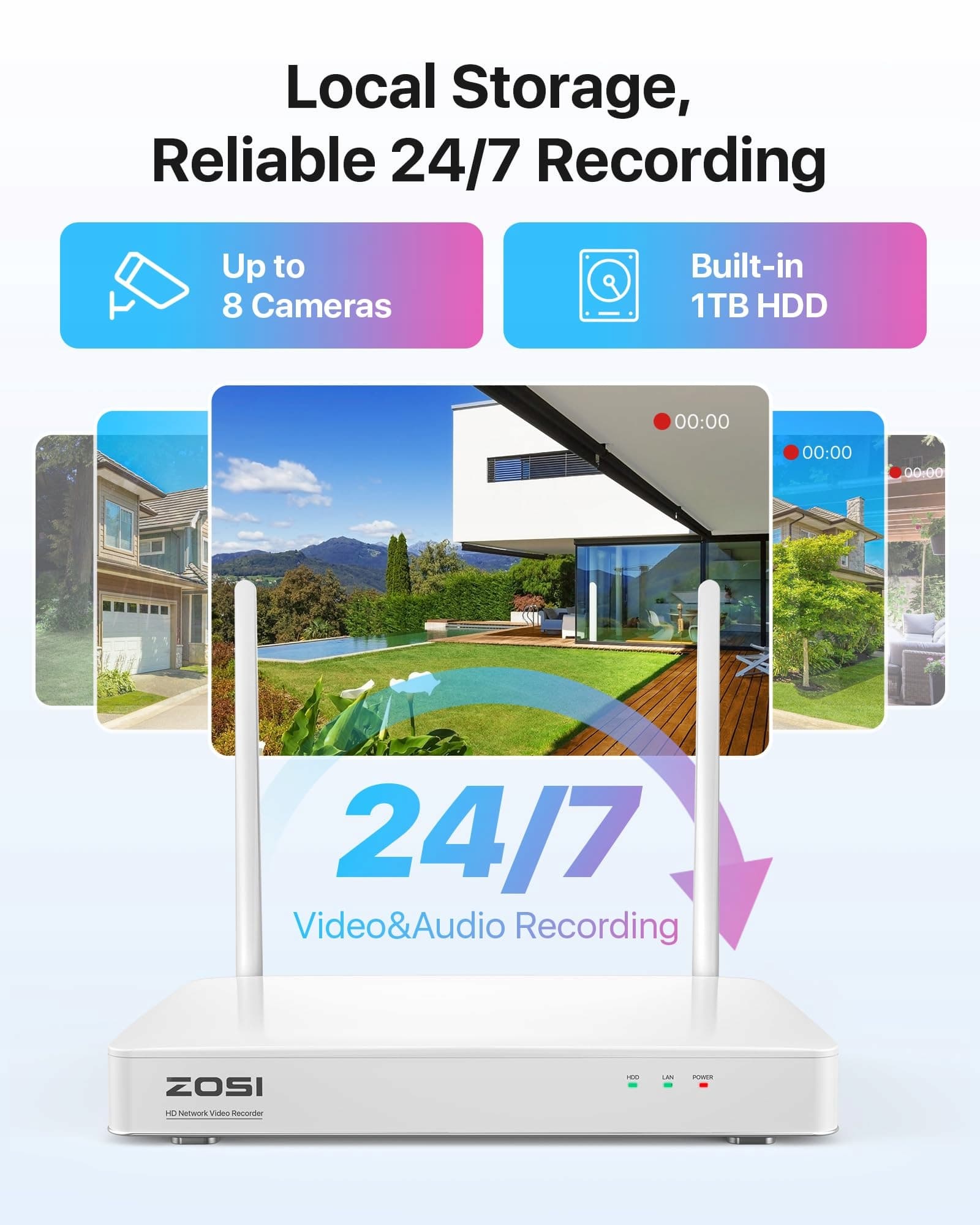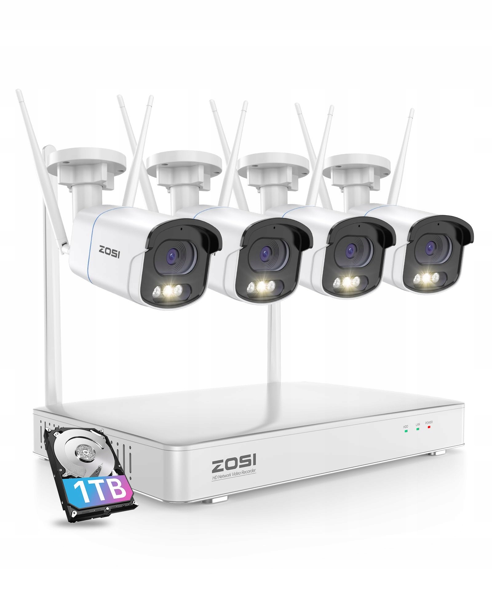 ZOSI 4MP WLAN Zestaw Kamer Monitoringu Zewnętrznego, 8CH 1TB NVR z 4X Kamerą WiFi Outdoor, Wykrywanie Osób i Pojazdów, Dwukierunkowe Audio, Kolorowa Nocna Wizja