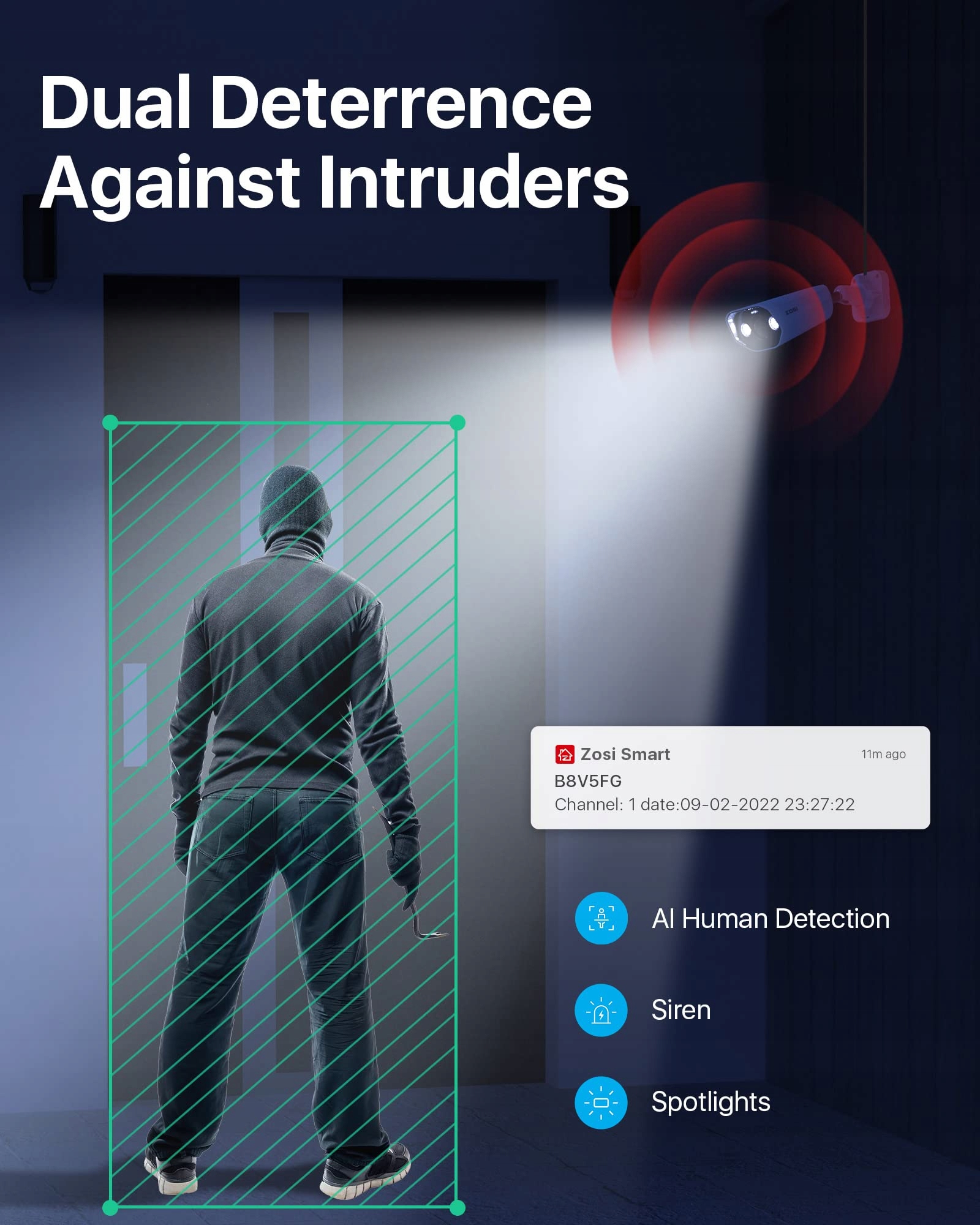 𝐈𝐧𝐭𝐞𝐥𝐢𝐠𝐞𝐧𝐭𝐧𝐞 𝐰𝐲𝐤𝐫𝐲𝐰𝐚𝐧𝐢𝐞 𝐨𝐬ó𝐛: Dzięki algorytmowi sztucznej inteligencji ten system monitoringu kamer dokładnie identyfikuje ludzi i uruchamia wbudowaną syrenę oraz reflektory, aby odstraszyć intruza. Otrzymujesz powiadomienia push w czasie rzeczywistym oraz alerty e-mail, dzięki czemu możesz natychmiast zareagować i odstraszyć niepożądane osoby za pomocą dwukierunkowego audio.