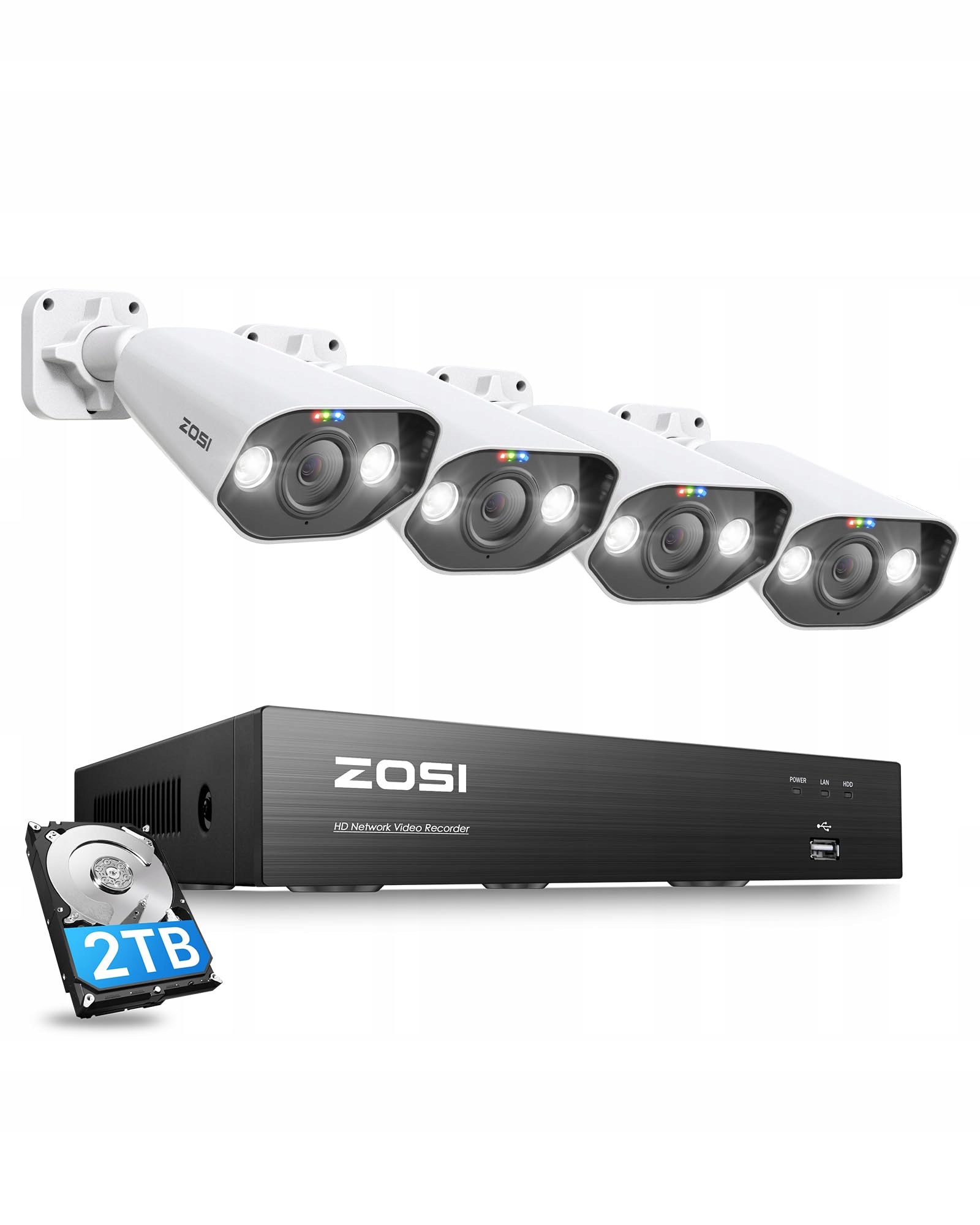 ZOSI 4K PoE Zestaw kamer do monitoringu z 8CH 2TB HDD NVR oraz 4X 8MP zewnętrzną kamerą PoE IP, wykrywanie osób, kolorowe widzenie nocne, naświetlacz zewnętrzny, inteligentny system monitoringu wideo