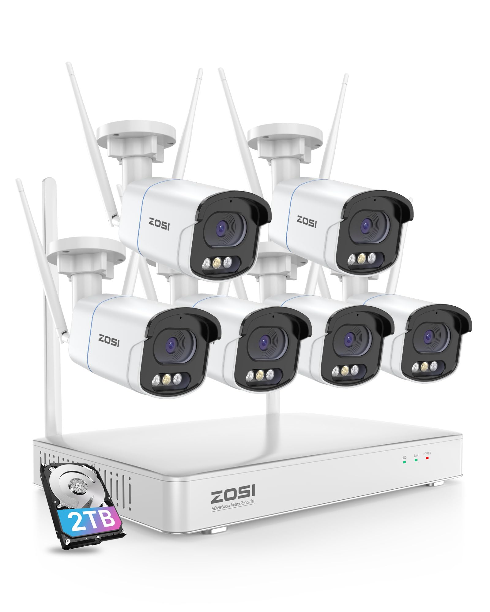 ZOSI 4MP WLAN Zestaw Kamer Monitoringu Zewnętrznego, 6X Kamera WiFi Outdoor, 8CH 2.5K NVR z Dyskiem 2TB, Inteligentny Tryb Nocny, Wykrywanie Osób i Pojazdów, Ostrzeżenie Reflektorem
