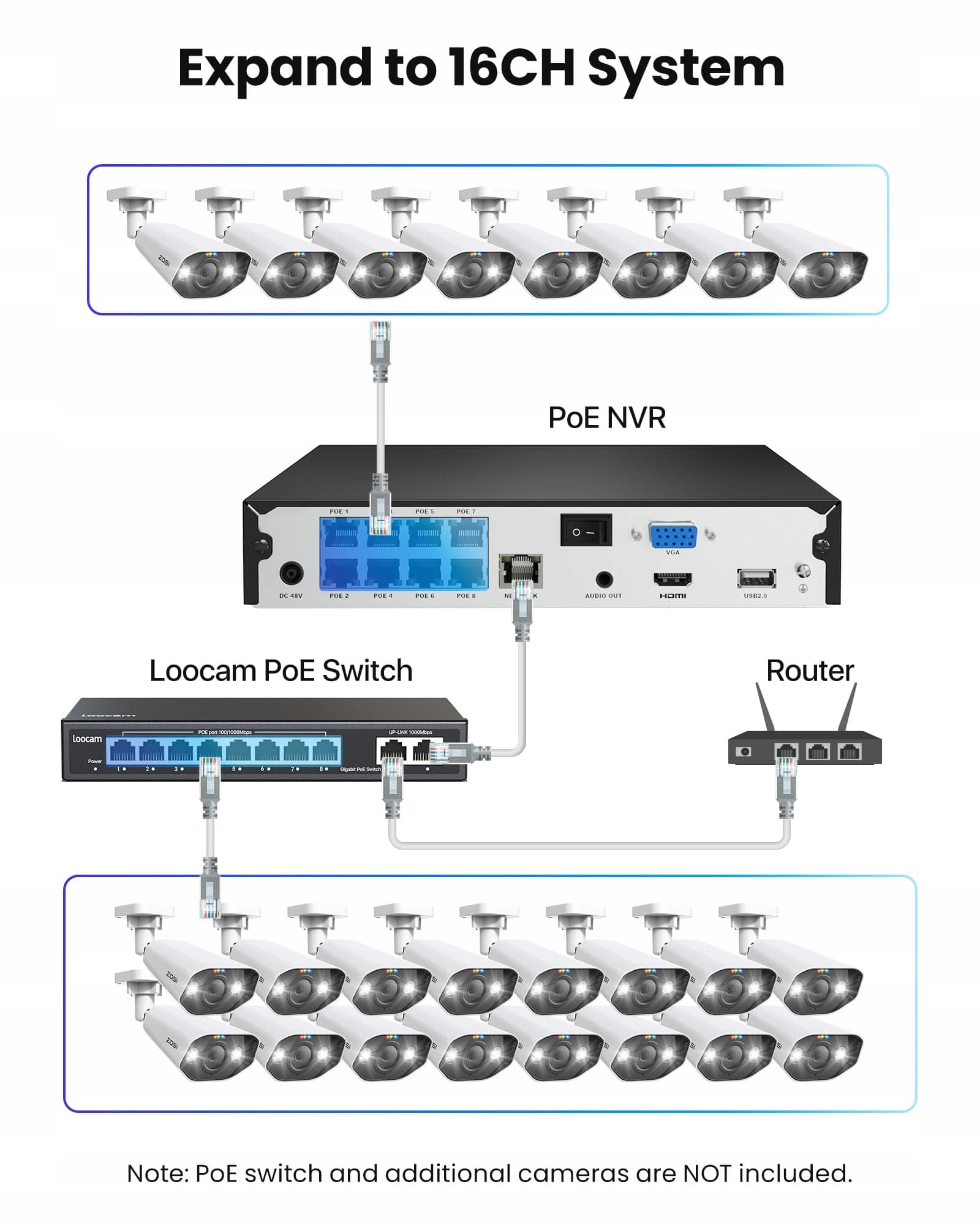5MP Ultra HD z automatycznym śledzeniem: System kamer zewnętrznych PoE dostarcza ostre nagrania w rozdzielczości 2880x1620 pikseli w dzień i w nocy. Obrotowe i pochylane kamery kopułkowe inteligentnie wykrywają ruch dzięki automatycznemu śledzeniu, zapewniając tym samym nieprzerwaną kontrolę bez martwych stref. Profesjonalne rozwiązanie bezpieczeństwa dla dużych obszarów, takich jak ogrody, magazyny, podwórka i tereny przemysłowe.
