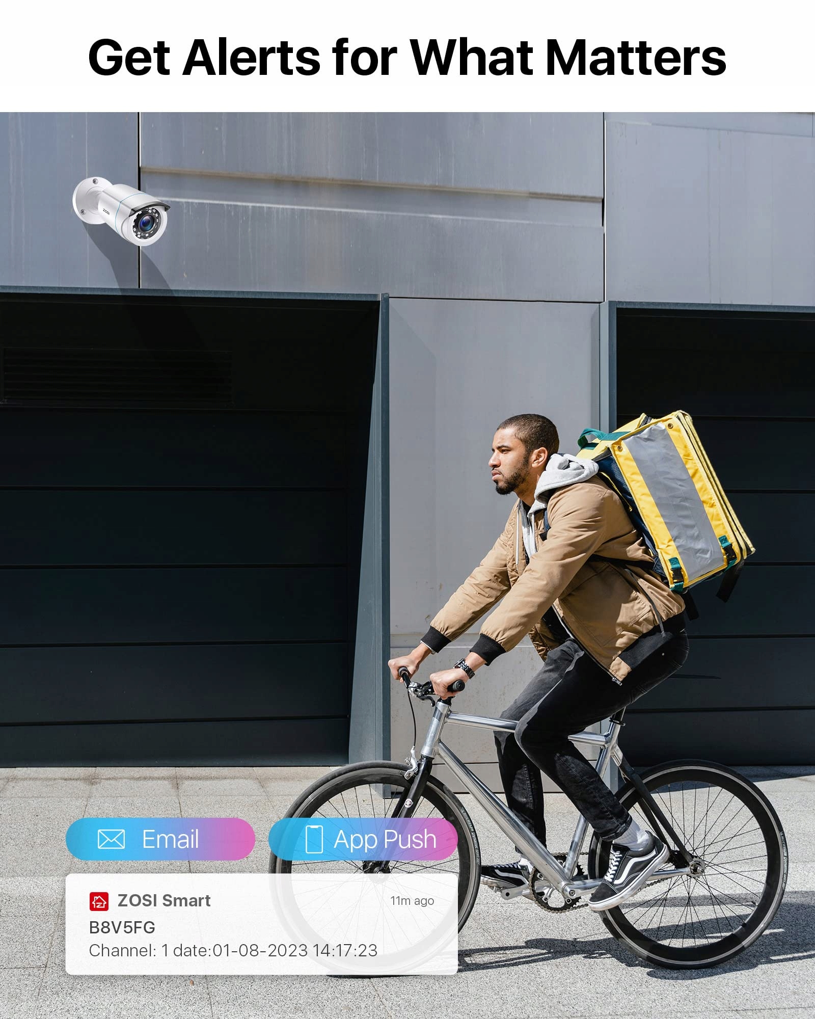Inteligentne wykrywanie ruchu: Czuły czujnik ruchu wykrywa ruch w obszarze monitorowanym przez kamerę bezpieczeństwa i w przypadku nieautoryzowanego wejścia wysyła alarm za pomocą e-maila i aplikacji. Można ustawić niestandardowe obszary wykrywania ruchu, aby zmniejszyć liczbę fałszywych alarmów i otrzymywać powiadomienia tylko o rzeczywistych zdarzeniach.