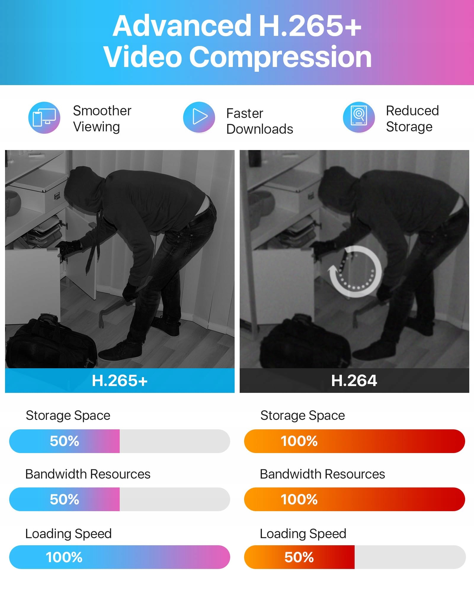 Nagrywanie przez całą dobę: Dzięki wstępnie zainstalowanemu dyskowi twardemu 1TB rejestrator oferuje ciągłe nagrywanie 24/7 oraz stabilne odtwarzanie w dobrej jakości. W trybie wykrywania ruchu system może nagrywać wideo przez ponad 30 dni. Wszystkie nagrania są przechowywane lokalnie i nie są przesyłane do chmury, aby chronić Twoją prywatność.