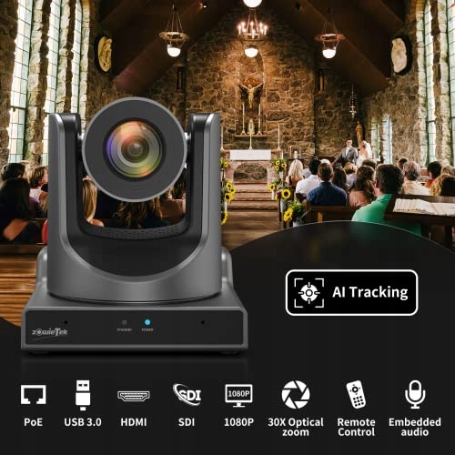 zowietek New Gen AI Tracking PTZ Kamera PoE | KI-Tracking-| 30-krotny zoom optyczny | Jednoczesne wyjścia SDI, HDMI i USB | IP-Live-Streaming dla zebrań, kościołów, wydarzeń, nauczania