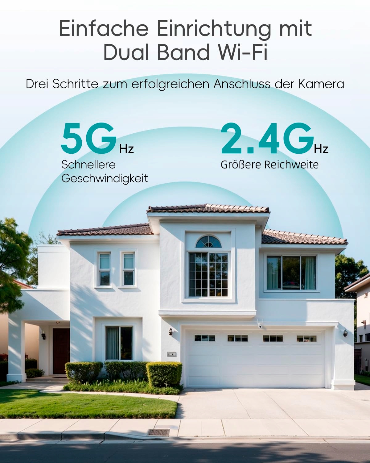 【WLAN 2,4/5G i dwukierunkowy dźwięk w czasie rzeczywistym】Obsługuje sieć Dualband WLAN (2,4 GHz/5 GHz): 5 GHz dla szybszej transmisji z mniejszą liczbą przerw; 2,4 GHz dla większego zasięgu i lepszego przenikania. Wbudowany mikrofon i głośnik umożliwiają dwukierunkową komunikację w czasie rzeczywistym.