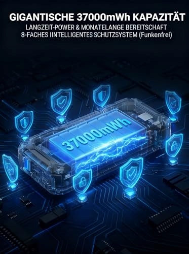 OGROMNA POJEMNOŚĆ 37000mAh: BEZPIECZEŃSTWO NA DŁUŻSZĄ METĘ: Dzięki wiodącej na rynku pojemności akumulatora możesz wielokrotnie udzielać pomocy przy rozruchu lub wielokrotnie ładować swój smartfon. Ta ogromna rezerwa energii zapewnia bezpieczeństwo i eliminuje obawy o „utrzymanie ładowania”. Raz naładowany, gotowy do użycia przez miesiące.
