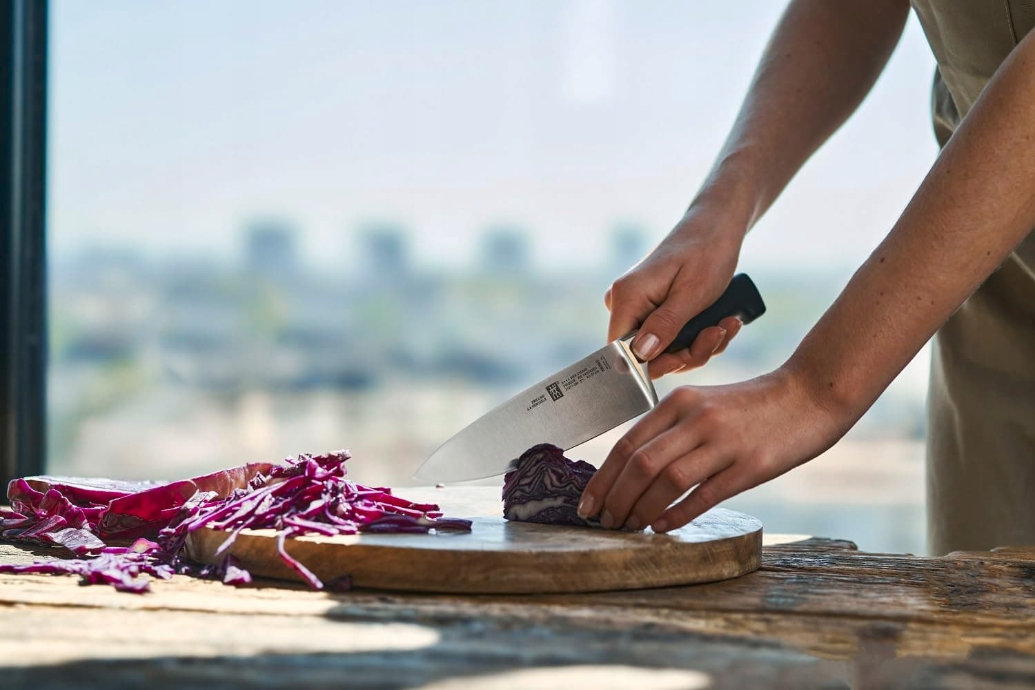 Idealny dla profesjonalnych i amatorskich kucharzy: Nóż kuchenny (długość ostrza: 20 cm) do krojenia mięsa, ryb, warzyw oraz siekania i ważenia ziół, przypraw itp.