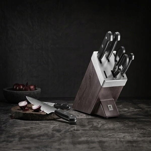 Zakres dostawy: 1 x ZWILLING Pro samostrzący blok na noże, 7-częściowy, 1 nóż do obierania i dekorowania (10 cm), 1 nóż uniwersalny (13 cm), 1 nóż do mięsa (16 cm), 1 nóż kuchenny (20 cm), 1 nóż do chleba (20 cm), nożyczki wielofunkcyjne, 1 blok, jesion/stop specjalny, kolor: brązowy, 1002894